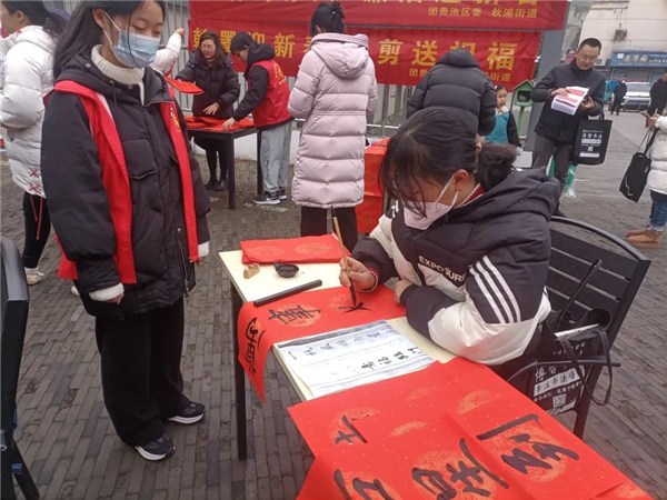 为充分挖掘春节文化内涵,弘扬优秀传统文化,营造欢乐喜庆、祥和文明的节日氛围。1月26日,团贵池区委联合秋浦街道在孝肃街广场开展“翰墨迎新春,妙剪送祝福——迎新春送春联、剪纸送祝福”主题活动。