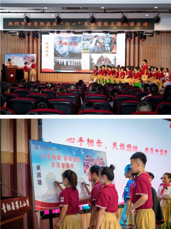 为深入学习贯彻习近平总书记关于加强和改进民族工作的重要思想,深化新时代青少年民族团结教育,进一步深化铸牢中华民族共同体意识,激发爱国主义情感,5月29日下午,池州市暨青阳县庆“六一”民族团结主题队课活动在青阳县第三小学举办。