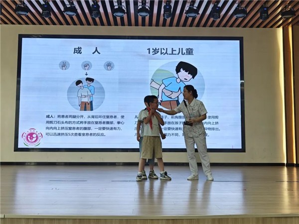 讲师从“海姆立克”急救法的由来、急救的基本方法、手的正确摆放位置、按压频率及力度等方面内容进行了细致入微的讲解。随后,还指导少先队员们进行实操演练,进一步提升少先队员们面对突发事件的应对能力。