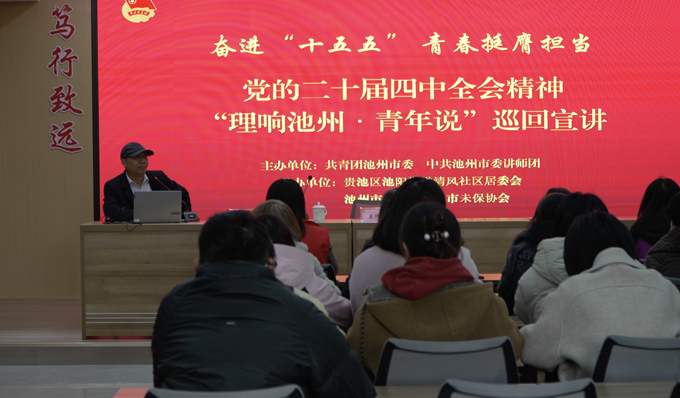 12月12日,“理响池州·青年说”党的二十届四中全会精神巡回宣讲走进贵池区池阳街道清风社区,市青年讲师团成员、市心理学会秘书长、市未成年人社会保护协会会长谭甲文面向社区居委会工作人员、物业管理人员代表开展专题宣讲。