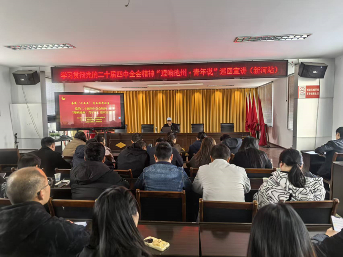 12月19日,“理响池州·青年说”党的二十届四中全会精神巡回宣讲活动走进青阳县新河镇十里岗村,市青年讲师团成员、市心理学会秘书长、市未成年人社会保护协会会长谭甲文面向镇村青年干部开展专题宣讲。