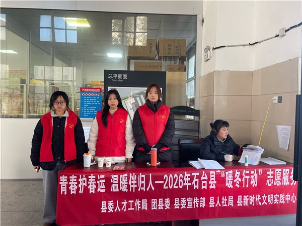 同时,团县委联合县委人才工作局、县委宣传部、县人社局、县新时代文明实践中心在县汽车站共同开展“青春护春运 温暖伴归人”——2026年石台县“暖冬行动”志愿服务。